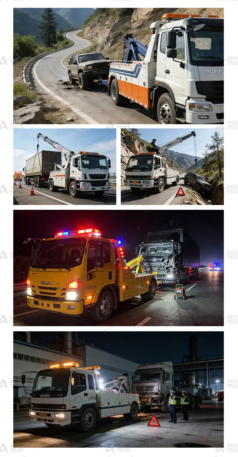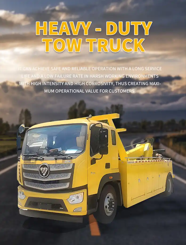 3. Large – tonnage hydraulic winch: High -strength wear -resistant steel -core ropes are selected. lt comes with a brake self – locking and slow – low-ering function. it does not slip or roll backward during heavy- load towing,and is suitable for extreme working conditions ofemergency towing ofheavy – duty vehicles.