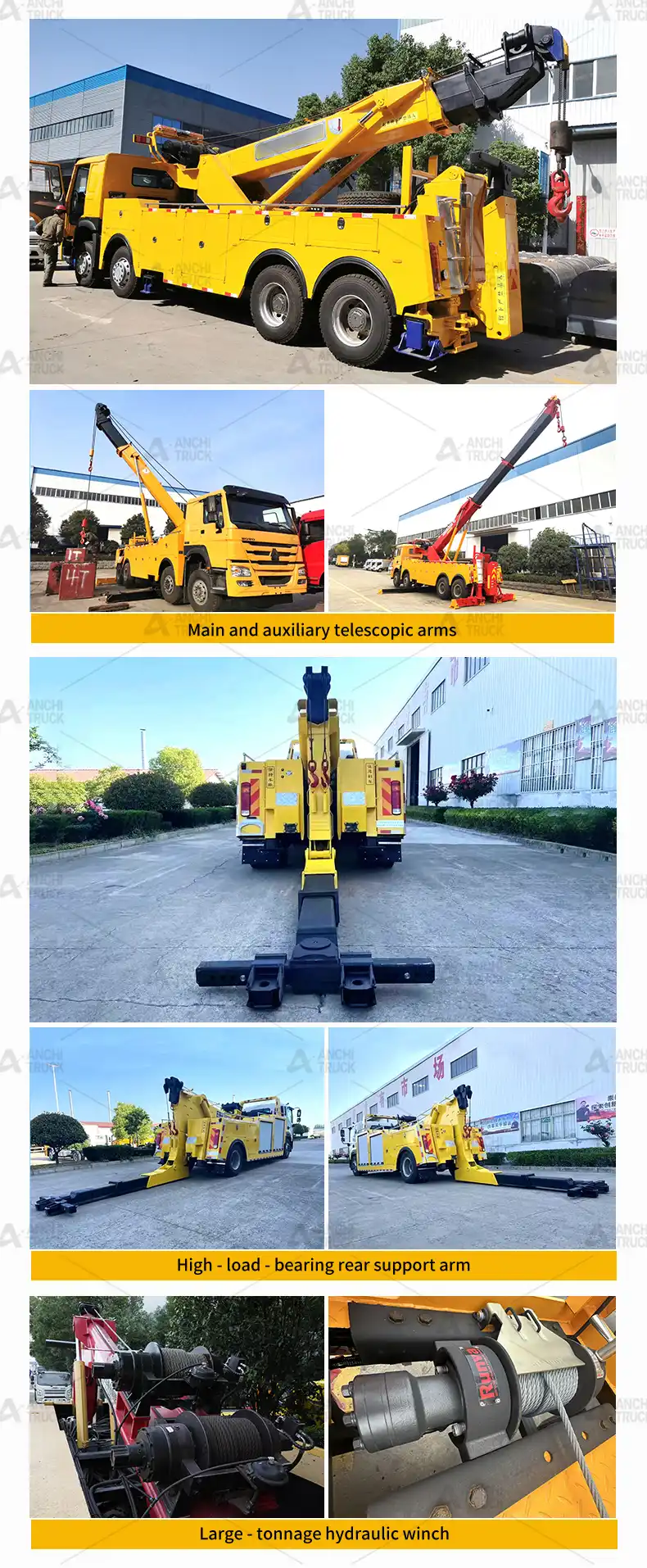 1. Main and auxiliary telescopic arms: They do not deform or bend underheavy loads. With a multi -section telescopic design, they have a wider operating radius, capable of handling situations such as heavy – vehicle roll-overs, fallinginto ditches, and long-distance towing. They can providedirect support.