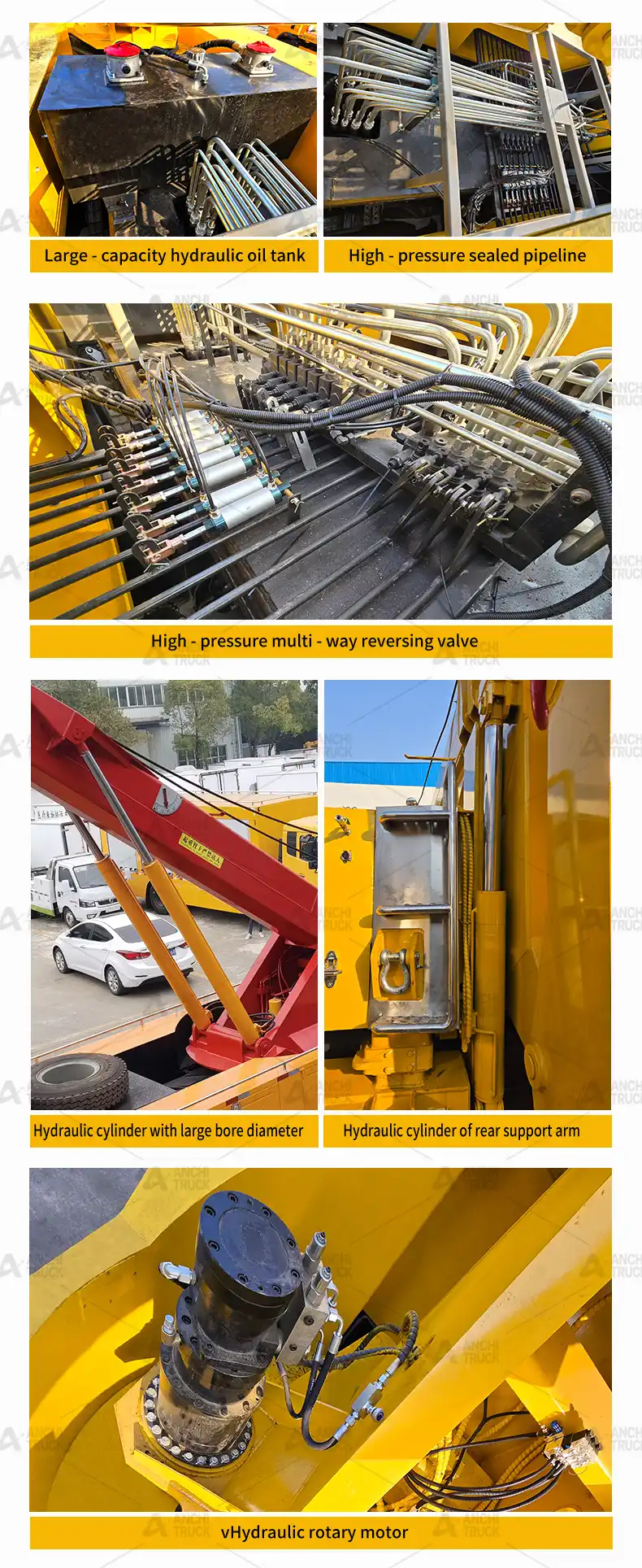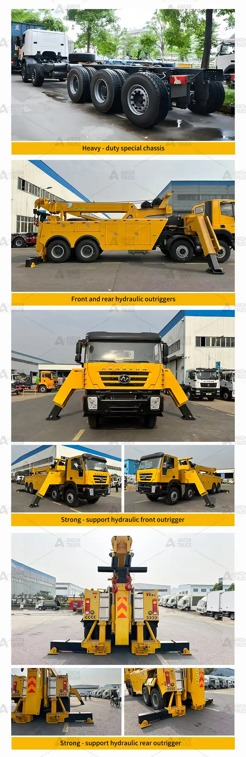2. High – load – bearing rear support arm: lt is integrally forged with in-creased thickness and width. lt supports multi – gear telescoping and multi-angle flipping (0 -90°), and is suitable for heavy – duty vehicles with differ-ent wheelbases and various fault postures (wheel – locked, rolled – over,axle – broken).it can realize the overall vehicle lifting and transportation.
