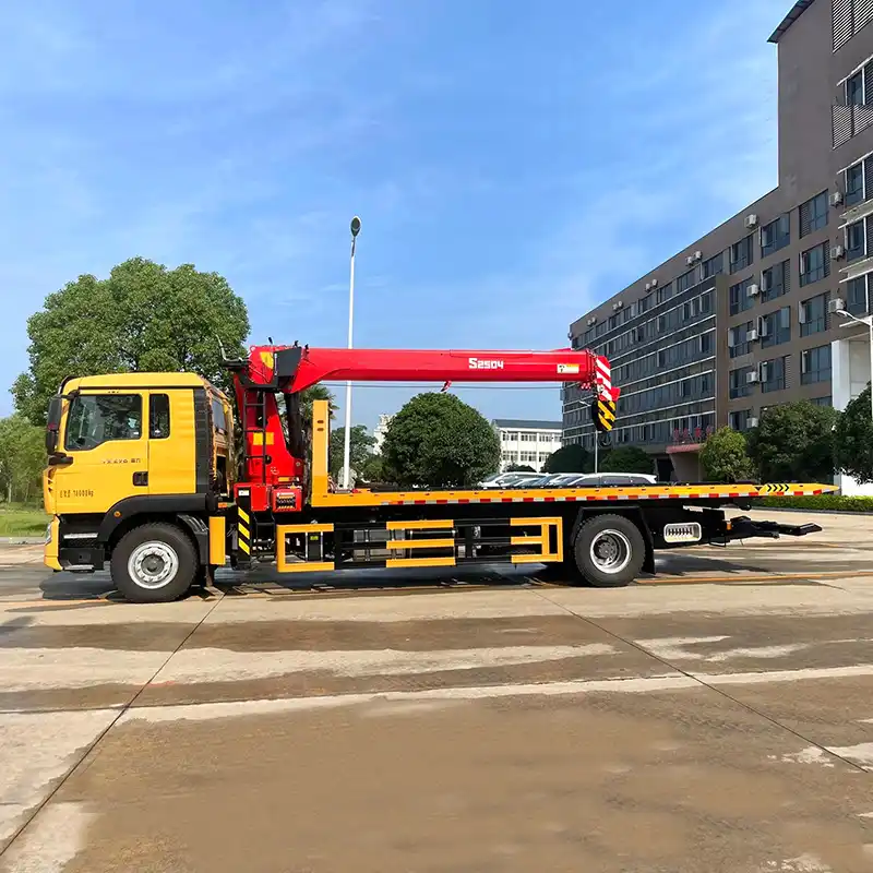 3. Flat – bed tow truck with a crane: A crane is installed, which can be usedto lift faulty vehicles that have fallen into ditches or rivers and are difficultto handle with the flat – bed towing method.