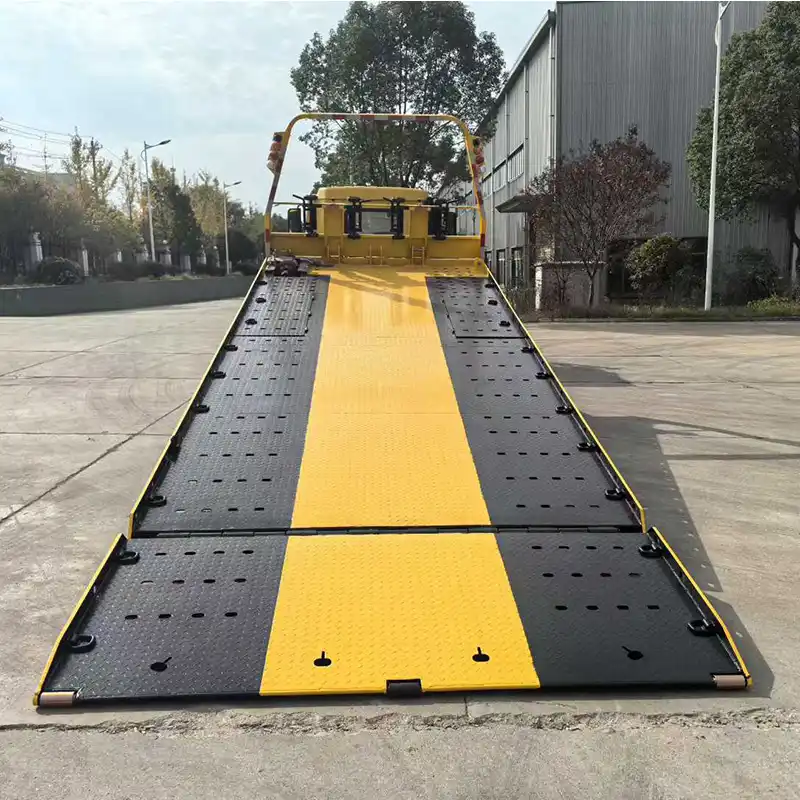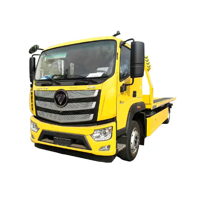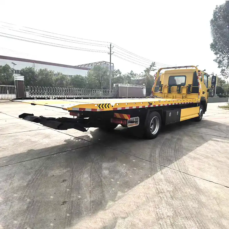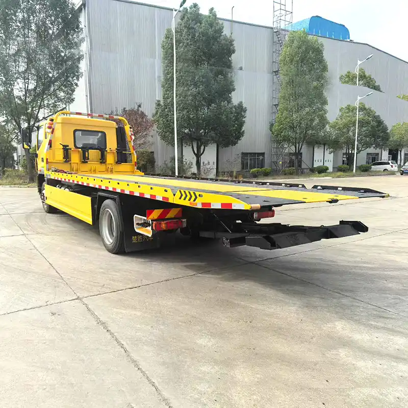 1. Dépanneuse à plateau complet : Le plateau peut se poser entièrement au sol. Lors du dépannage de véhicules à châssis bas, cela facilite la mise en place du véhicule sur le plateau et minimise les risques de dommages.